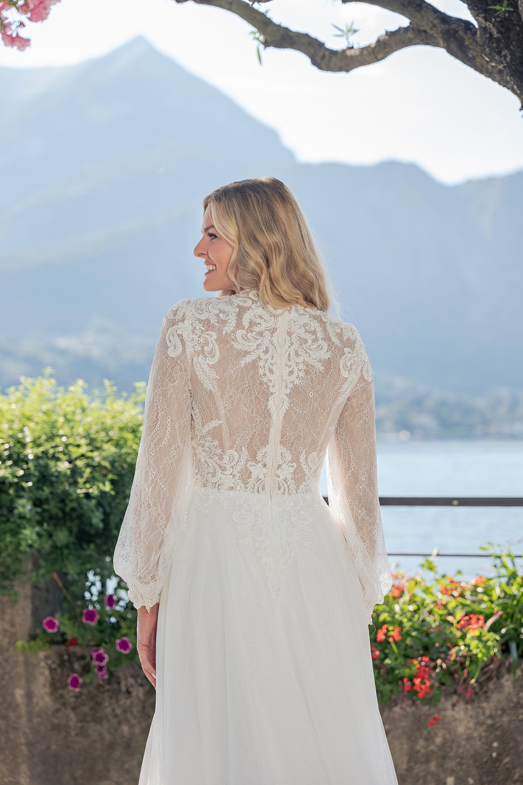 - hoch geschlossenes transparentes Oberteil mit zart glitzerndem Tüll und Spitze