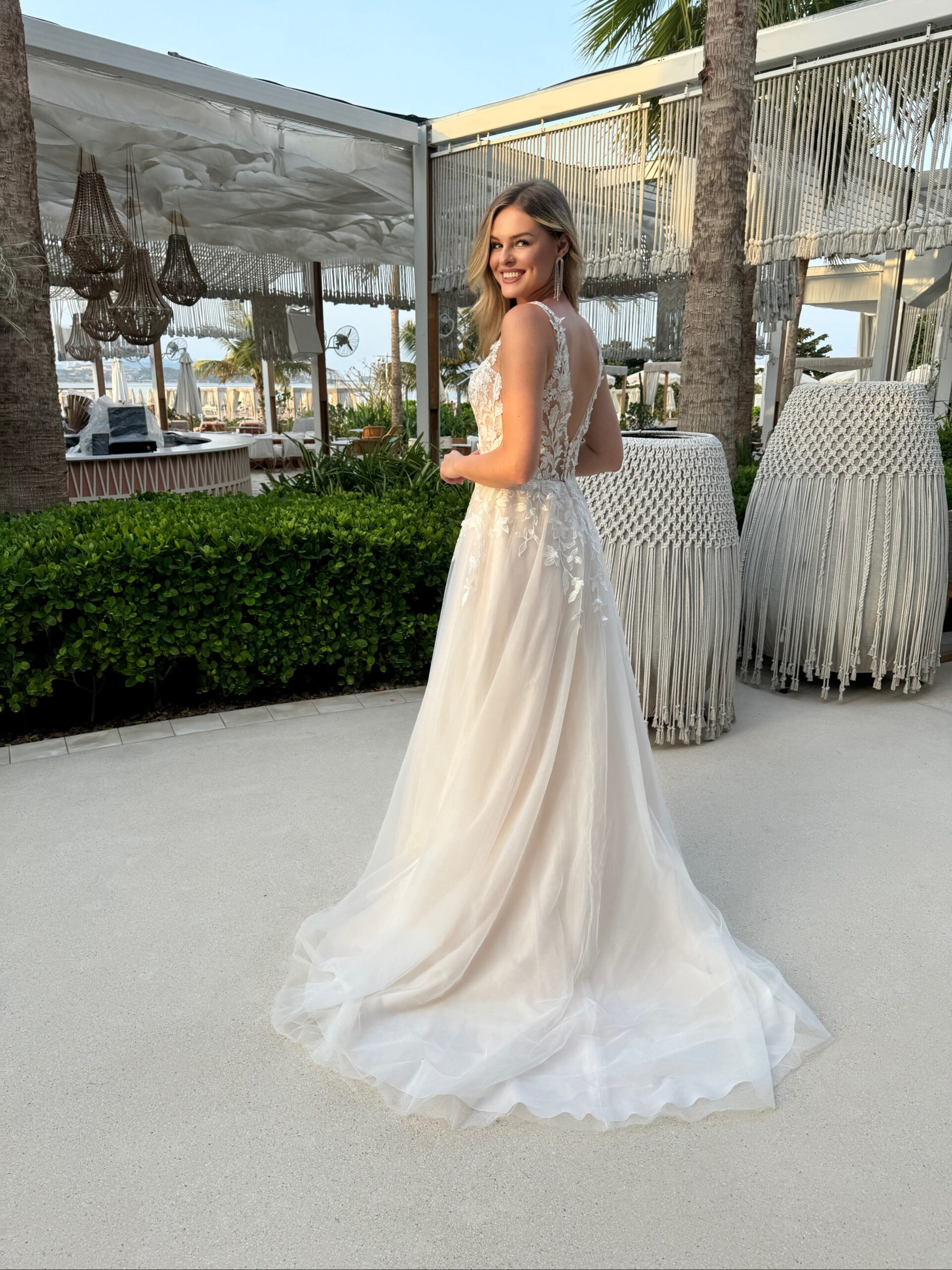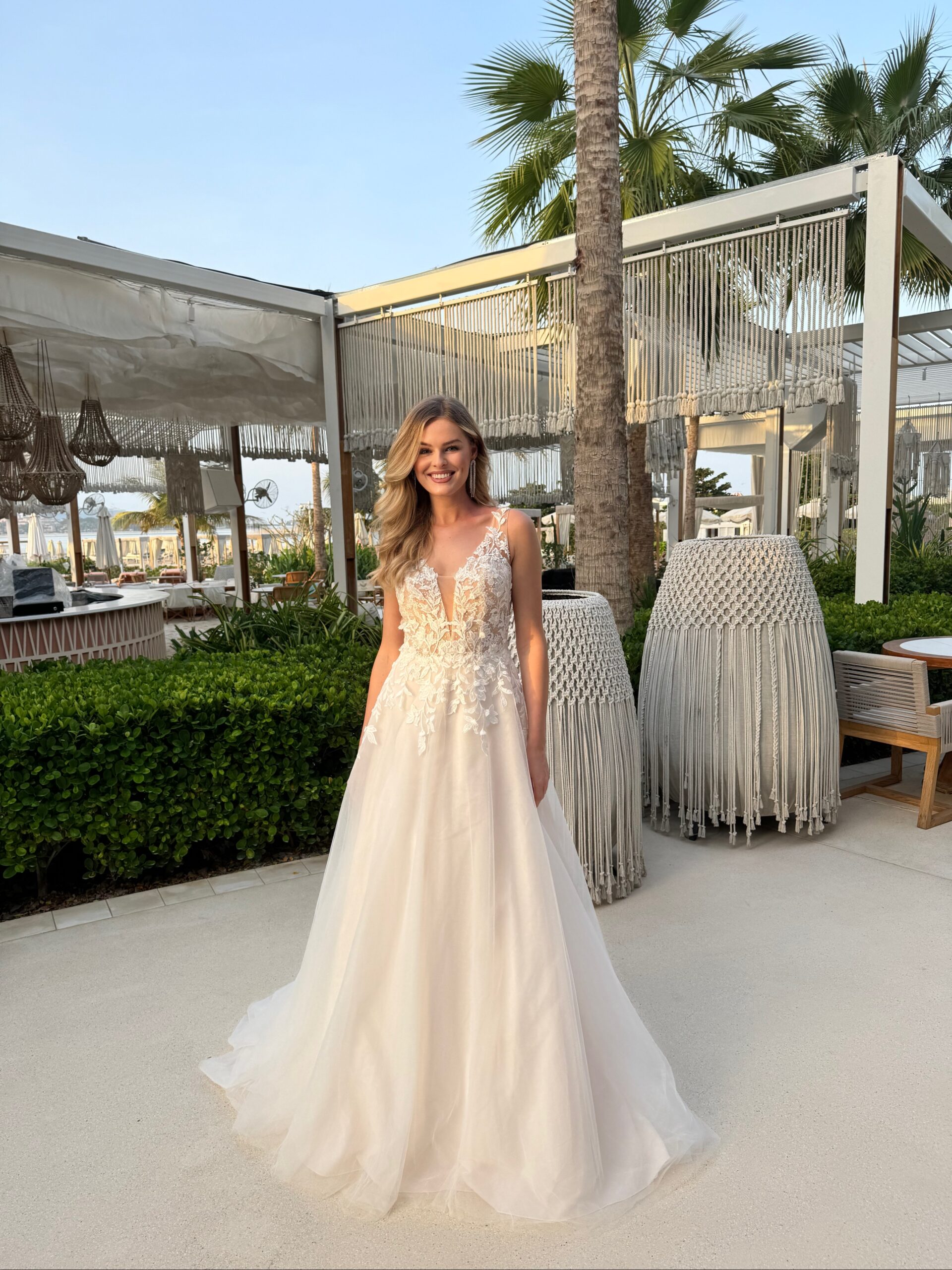 - A-Linie in den Farben Ivory oder Ivory/rumpink mit Tüllrock