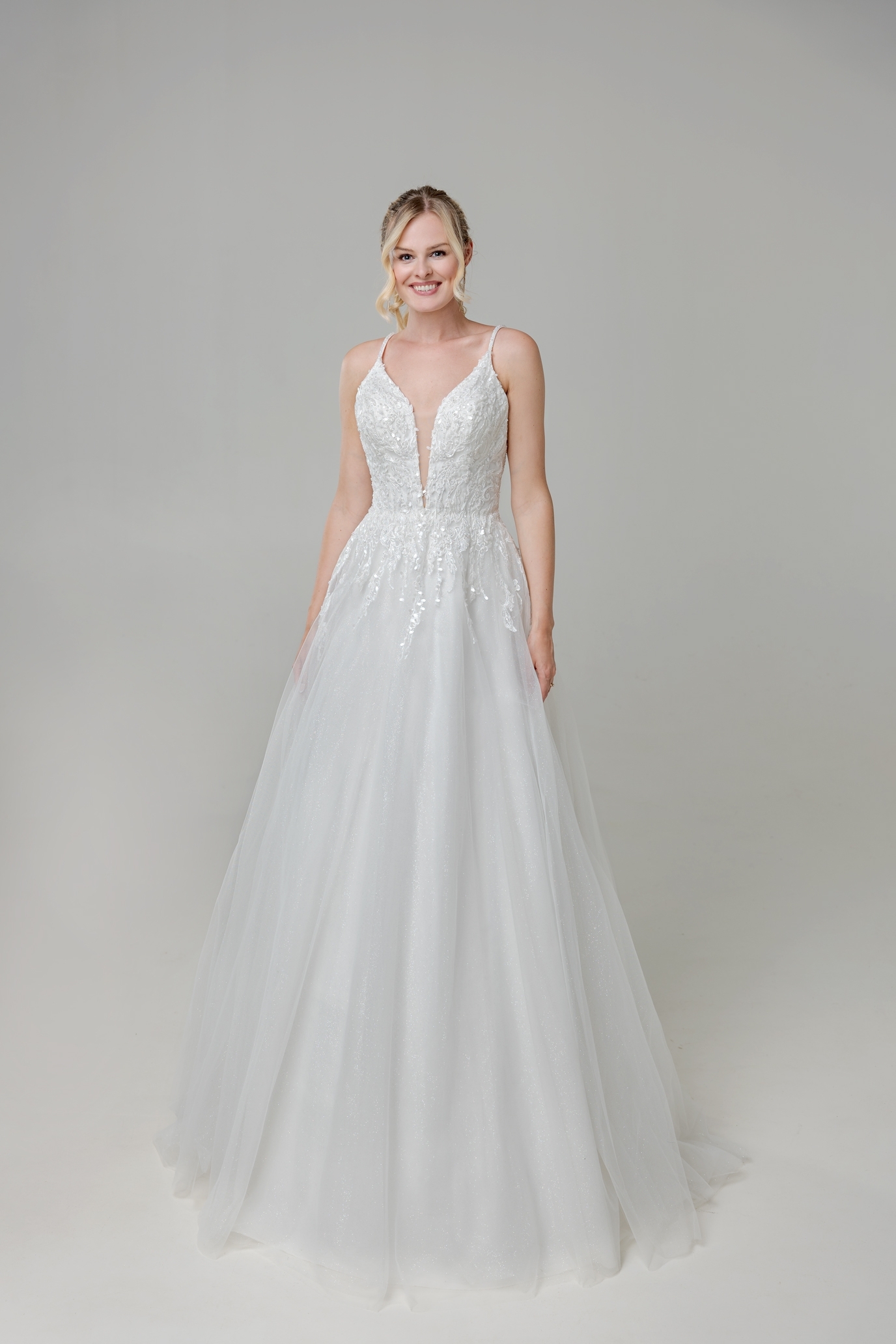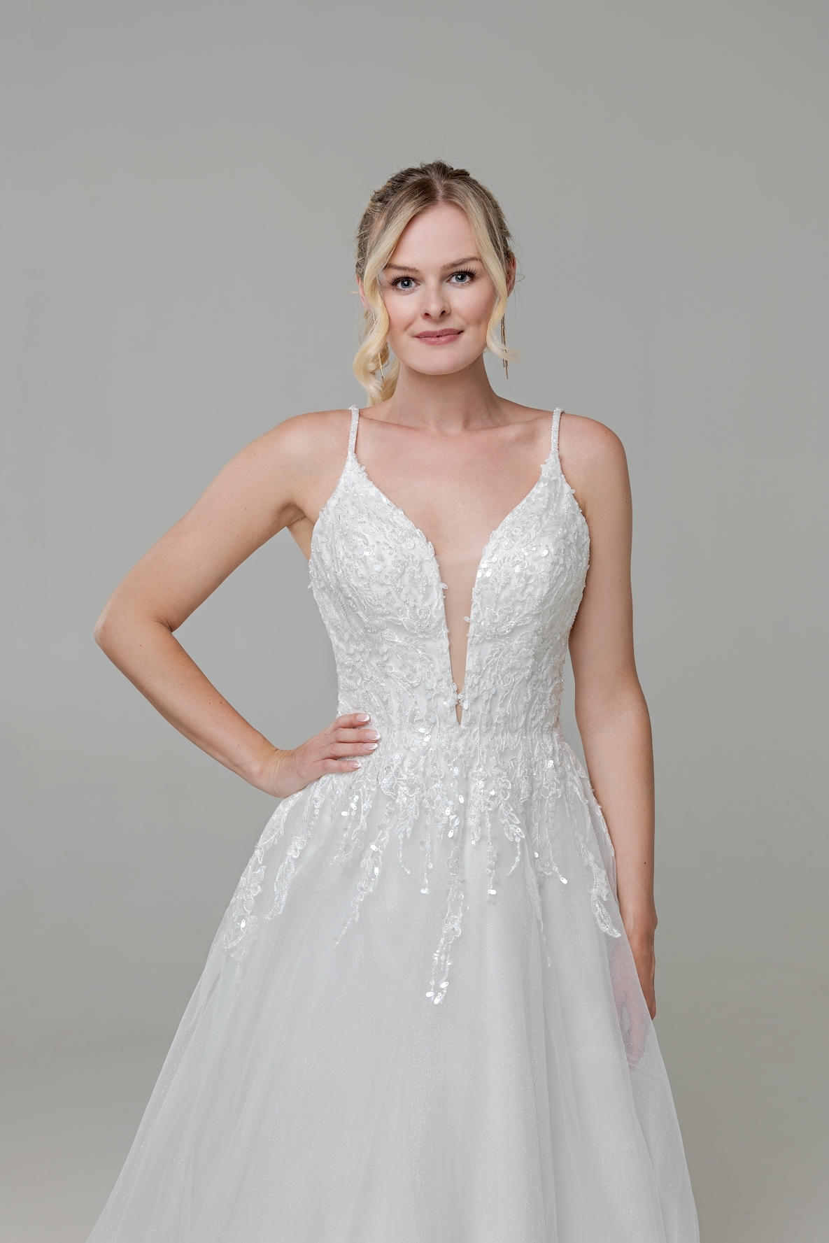 - Oberteil reichhaltig mit Spitze besetzt, Spitze in den Rock auslaufend