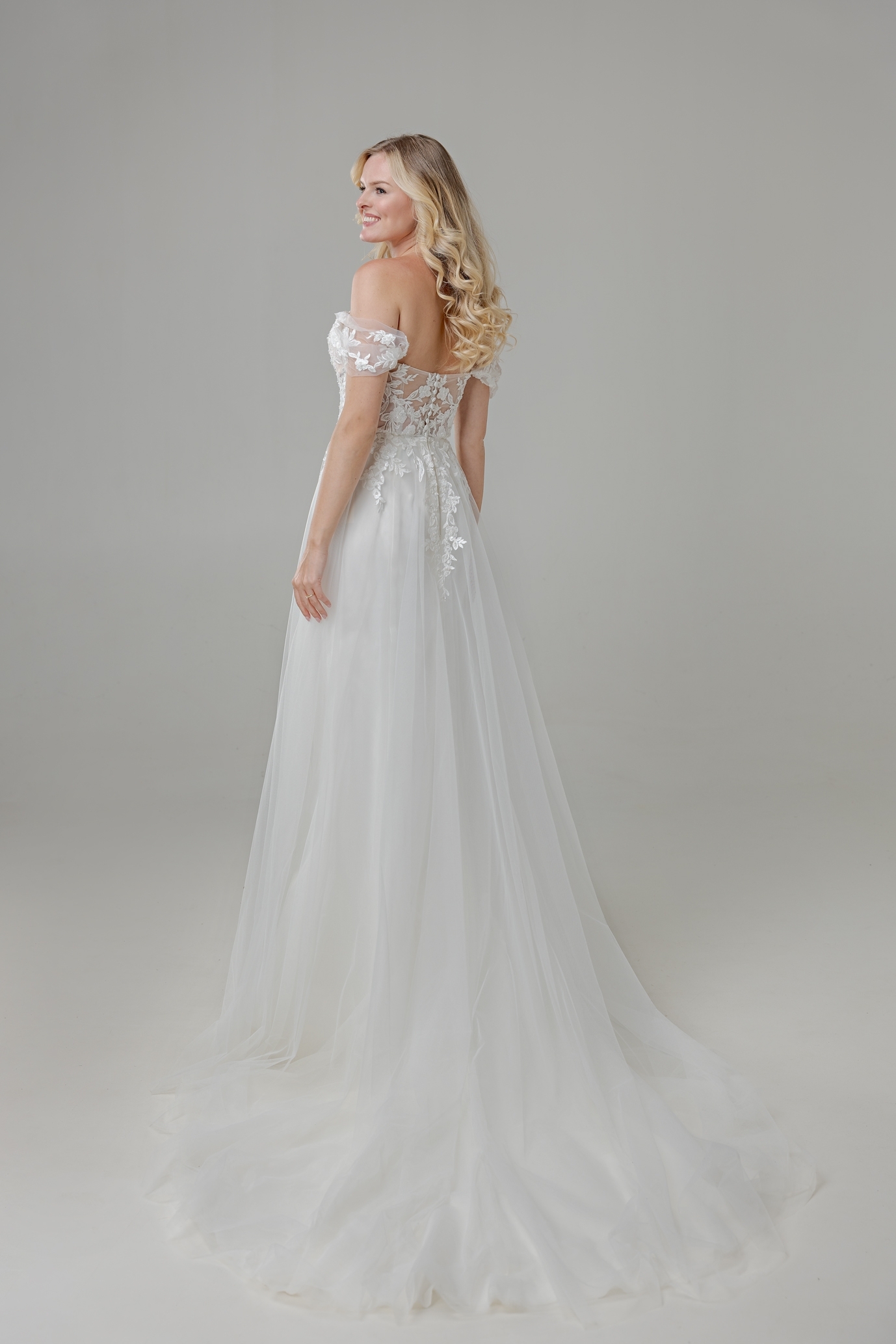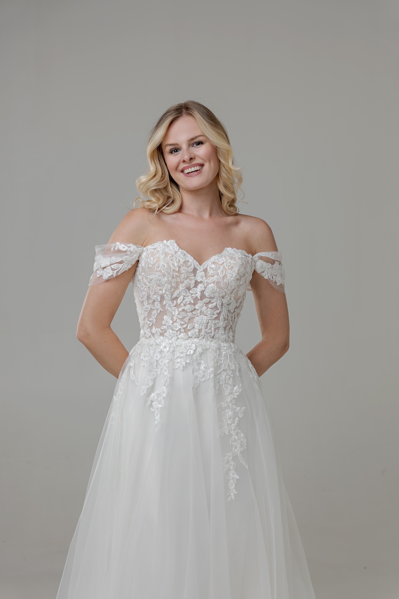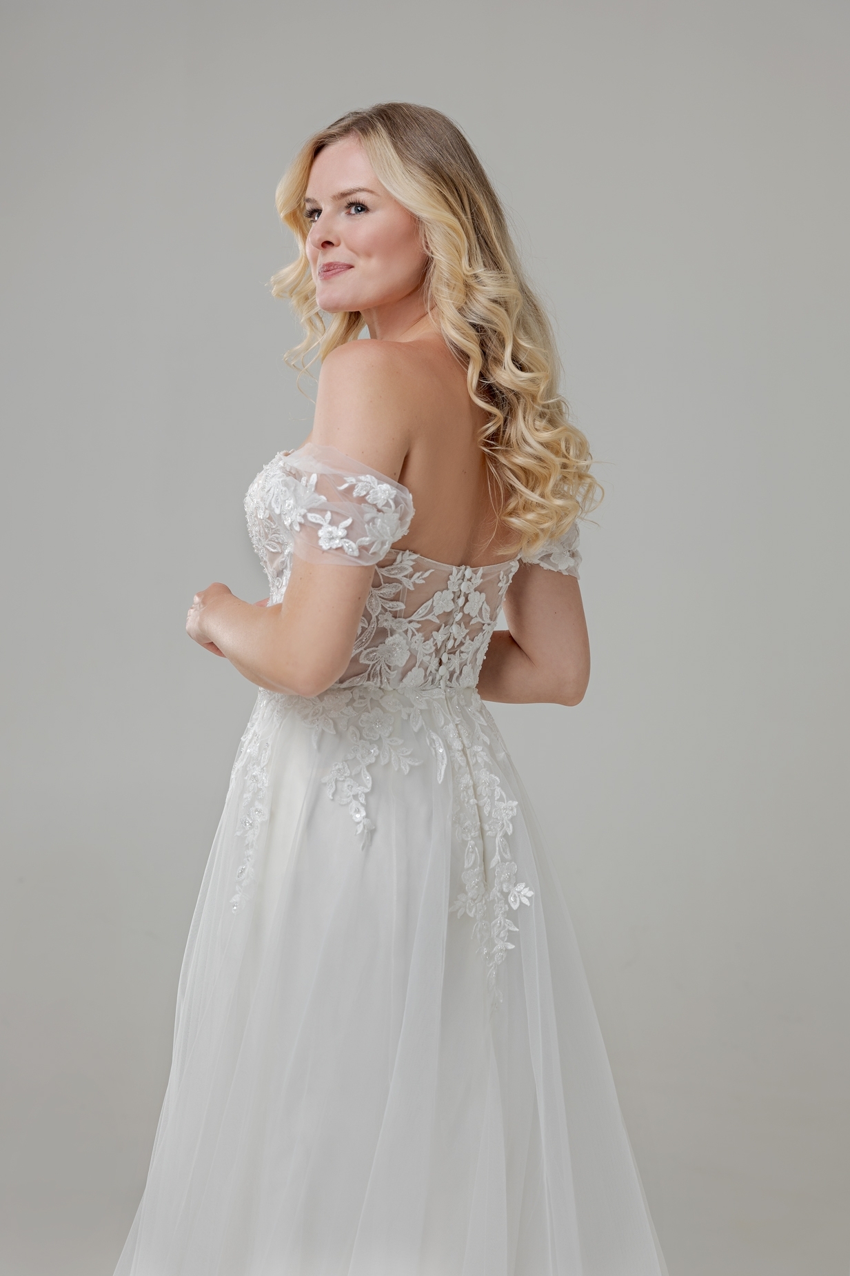 - Oberteil ist eine Coursage mit angesetzten Off-Shoulder-Ärmeln aus Tüll
